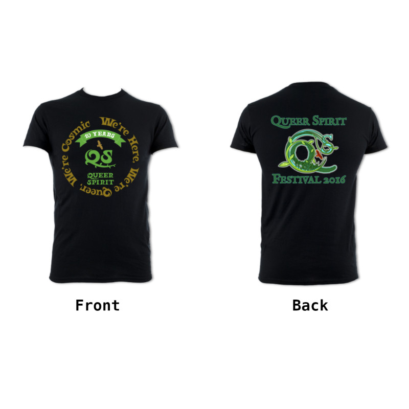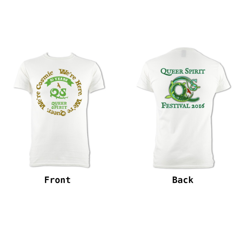 Queer Spirit Celebration T-shirt, front and back designs (adult sizes)